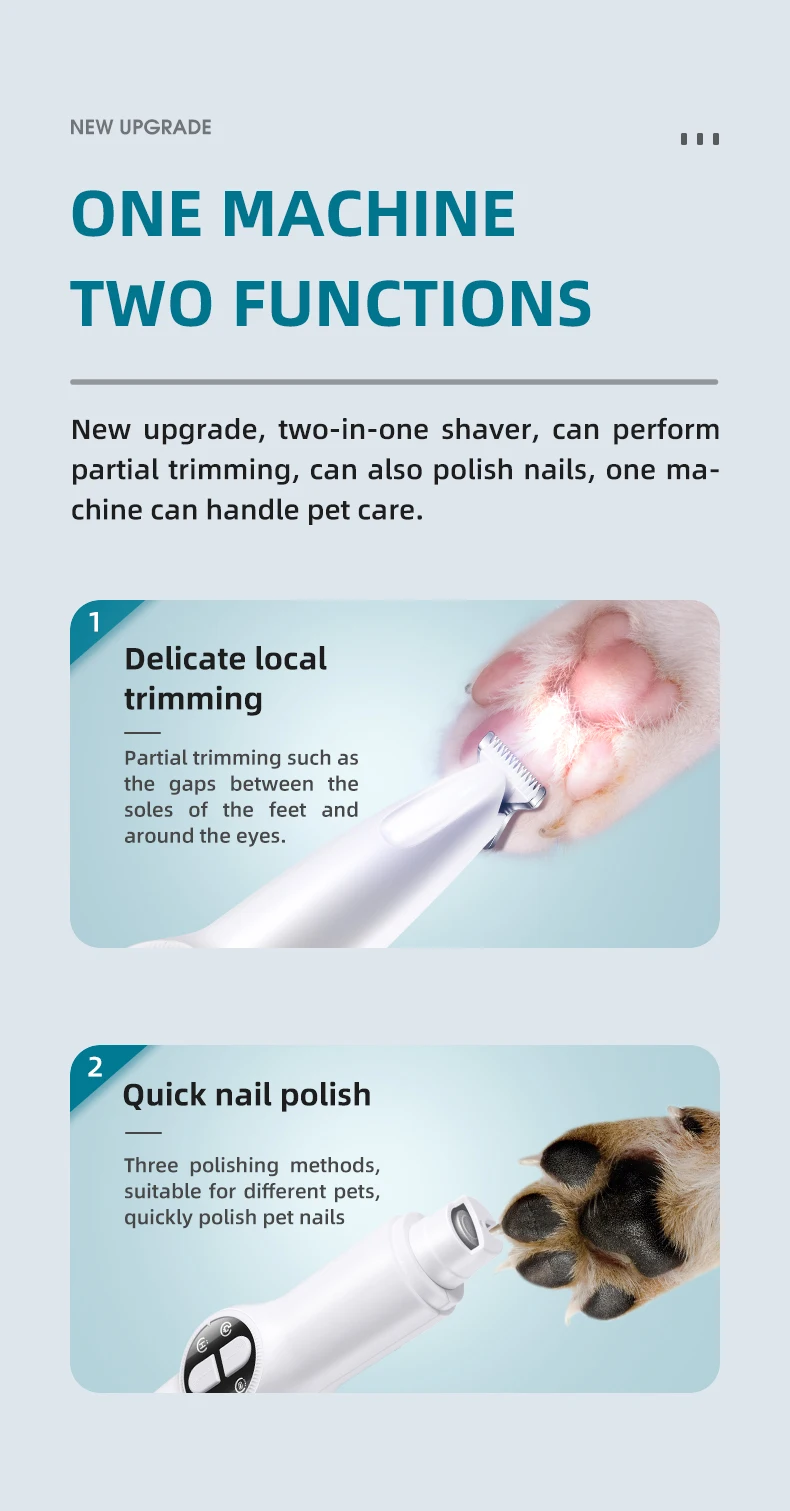Meet the 2 in 1 Electric Dog Nail Grinder & Partial Hair Trimmer—your quiet, two-in-one grooming tool for faster, calmer at-home paw care.