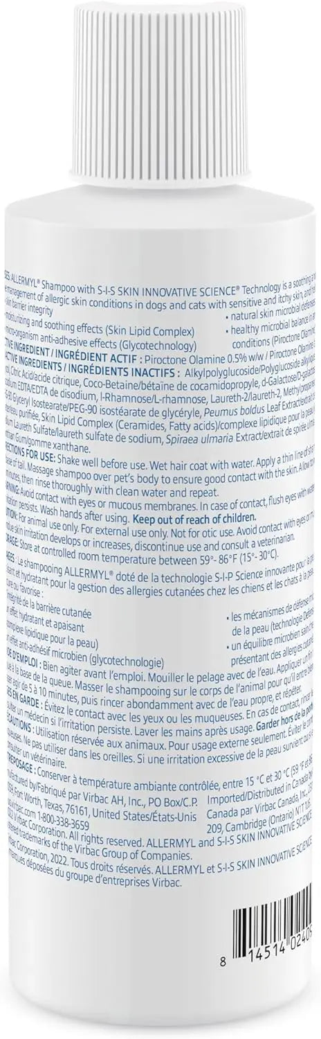 Relieve your dog’s and cat’s itchy skin with Virbac Allermyl Medicated Shampoo, a dermatologist-designed, veterinarian-endorsed solution that gently cleanses, soothes, and supports allergic skin management for daily comfort.
