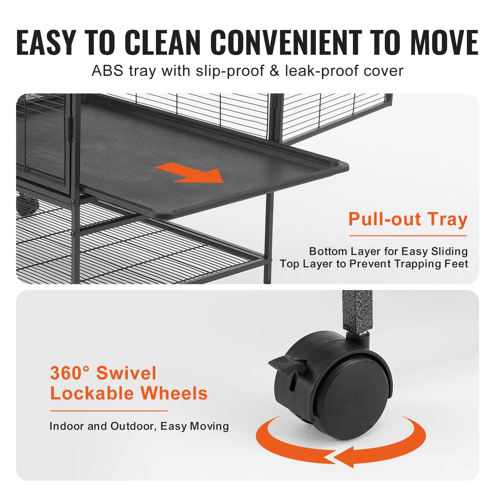 - Lockable wheels and two entry doors—plus a top window—make feeding, handling, and moving the cage indoors or outdoors effortless.